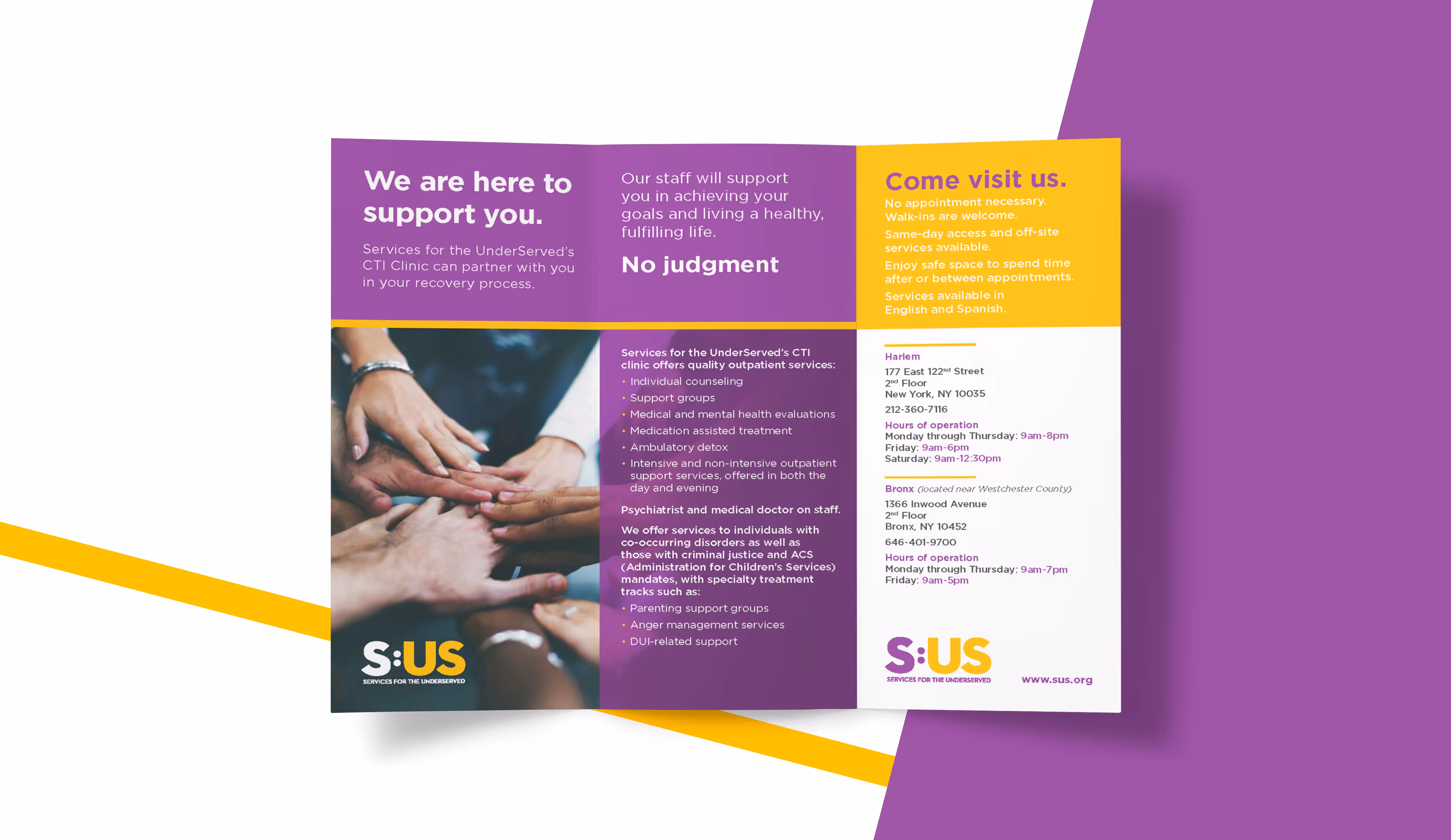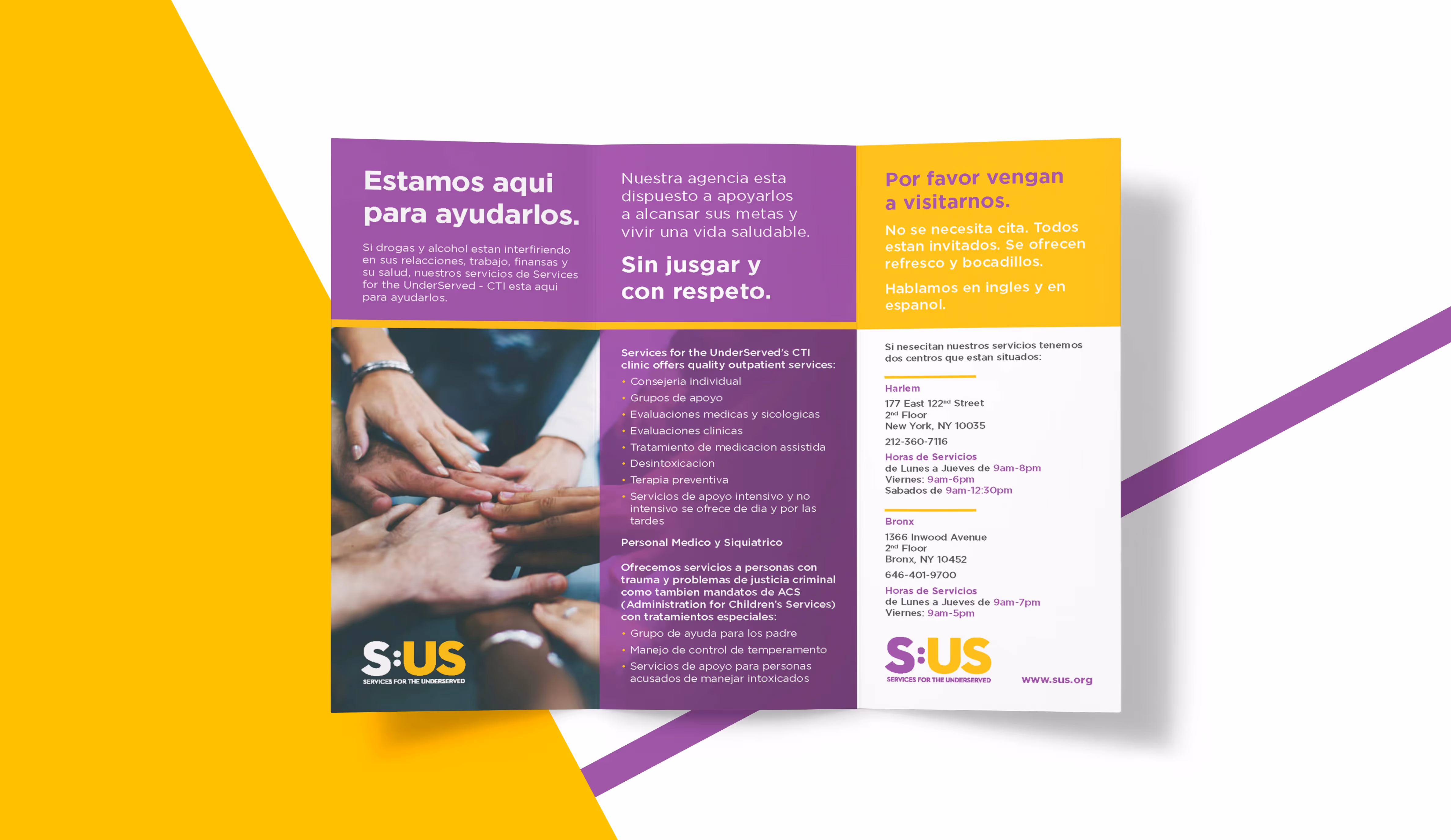We partnered with Services for the UnderServed (S:US) to design bilingual print materials for their CTI Clinic. Available in both English and Spanish, the brochures highlight outpatient services and promote judgment-free care for individuals seeking mental health and substance use support. The final design uses S:US’s bold, optimistic color palette and clear typography to foster trust, dignity, and inclusion across diverse communities.