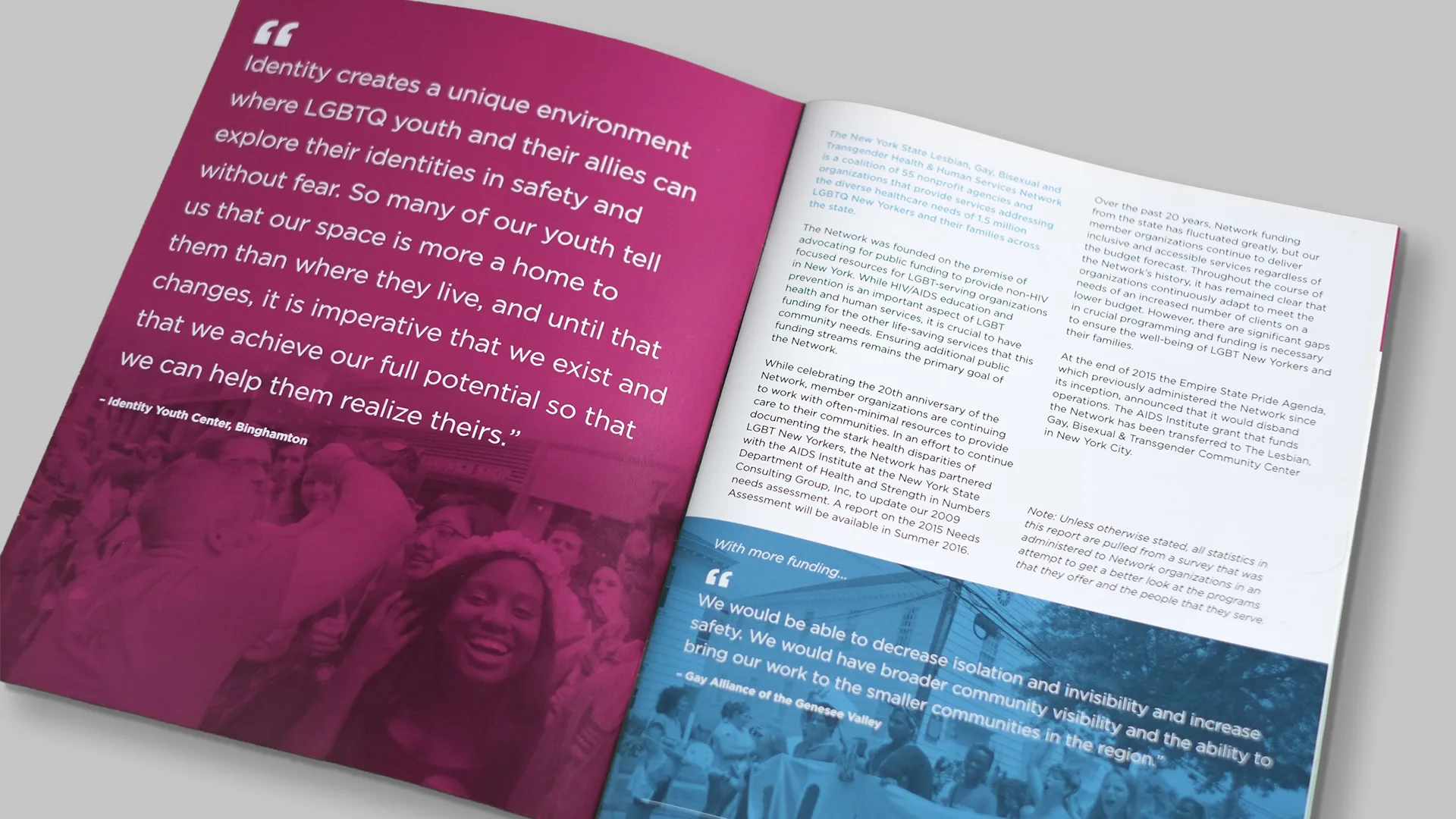 We partnered with the New York State LGBT Health & Human Services Network to design a comprehensive report visualizing the impact of over 50 member organizations serving LGBTQ New Yorkers. The publication combines data visualization, storytelling, and statewide mapping to highlight disparities in access, celebrate progress, and advocate for equitable health funding. Designed for clarity and emotional resonance, the report elevates the voices of community organizations working toward visibility, safety, and systemic change across all 62 counties of New York State.